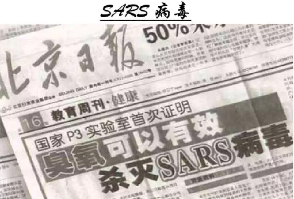 武漢大學生命科學學院的張珈敏,鄭從義等人在“中國消毒學雜志”2004年01期上發表的《臭氧水對SARS病毒的滅活效果觀察》一文中寫:用臭氧水對SARS病毒進行滅活實驗,當臭氧含量為27.73mg/L時,作用4min可完全滅活SARS病毒;當臭氧含量為17.82mg/L,作用4min和4.86mg/L作用10min,均可使SARS病毒的滅活率達100%。