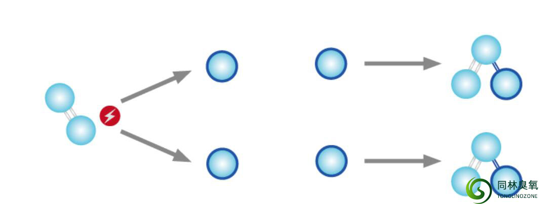 能量( 紫外光或閃電) 將氧分子 ( 氧氣)分解成單個氧原子                                        氧原子與其他氧分子 ( 氧氣) 形成弱鍵結(jié)合成為臭氧