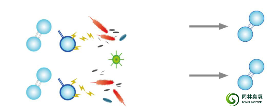 臭氧與有機物接觸后,會釋出弱鍵的氧原子,對有機物進行氧化                           臭氧對有機物進行氧化后還原成為氧分子 ( 氧氣)