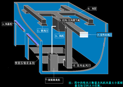 將臭氧除臭機產生的O2/O3混合氣體導入風機箱與已收集的惡臭氣體發生反應,利用O3快速分解臭氣中的各種有機揮發物。處理量通過內循環風機和排風機之間的比例分配進行調整。因此在室內形成了一個循環系統,不但能將吸入的垃圾臭氣分解,而且可逐步降低垃圾站室內的臭味濃度,從而創造一個更好的工作環境。
