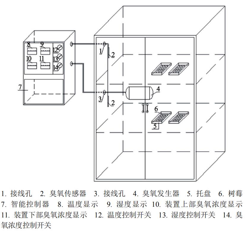 臭氧濃度是影響臭氧殺菌保鮮作用的 很重要因素,實(shí)現(xiàn)臭氧濃度的精準(zhǔn)化控制,才能保證臭氧處理達(dá)到理想的保鮮效果。目前果蔬冷藏庫、糧食貯藏庫等使用的臭氧發(fā)生裝置均沒有使用臭氧濃度測(cè)定傳感器,也沒有濃度自動(dòng)精準(zhǔn)控制裝置,主要是靠人為控制開機(jī)時(shí)間或設(shè)定開機(jī)時(shí)間估算環(huán)境中的臭氧濃度,因此使用空間內(nèi)的實(shí)際臭氧濃度具有一定的誤差,不夠準(zhǔn)確。另外,臭氧的處理方式、容器、環(huán)境溫濕度條件都會(huì)干擾臭氧濃度的精準(zhǔn)性,進(jìn)而影響果蔬貯藏保鮮效果。然而,目前相關(guān)研究中所使用的臭氧處理方式(長(zhǎng)期、定期、一次性)、容器(有機(jī)玻璃密封圓筒、庫房、聚乙烯薄膜袋、PE 薄膜大帳)、溫度、相對(duì)濕度等均有所不同,對(duì)果蔬的保鮮效果的影響也不同,因此造成研究結(jié)果的不一致,限制了臭氧處理在果蔬保鮮中的產(chǎn)業(yè)化應(yīng)用。因此,明確穩(wěn)定的溫濕度條件下精準(zhǔn)濃度臭氧處理對(duì)果蔬保鮮的影響效果,對(duì)于促進(jìn)臭氧在果蔬保鮮中的應(yīng)用具有重要意義。本研究采用國(guó)家農(nóng)產(chǎn)品保鮮工程技術(shù)研究中心自主研發(fā)的能夠精準(zhǔn)控制臭氧濃度的冷藏熏蒸處理裝置,通過在恒溫恒濕條件下,設(shè)定不同臭氧濃度,對(duì)樹莓進(jìn)行短時(shí)熏蒸處理,研究不同臭氧濃度處理對(duì)樹莓采后貯藏品質(zhì)的影響,以期為樹莓保鮮提供技術(shù)依據(jù),促進(jìn)臭氧精準(zhǔn)控制裝置在果蔬采后保鮮中的規(guī)?;瘧?yīng)用。