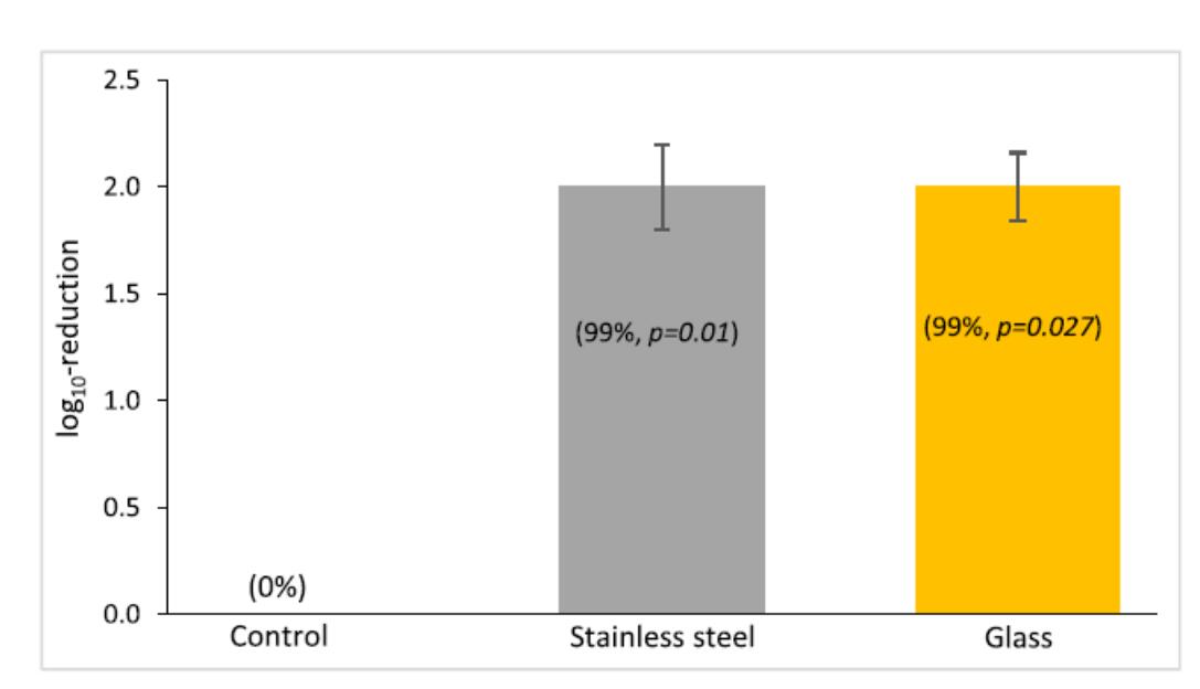 不銹鋼和玻璃上的臭氧滅活SARS-CoV-2(將100 μL的DMEM病毒溶液在SS或玻璃上干燥,然后暴露于相對(duì)濕度81%,T = 26?C, CT~15.0 g min/m3的臭氧中)。
