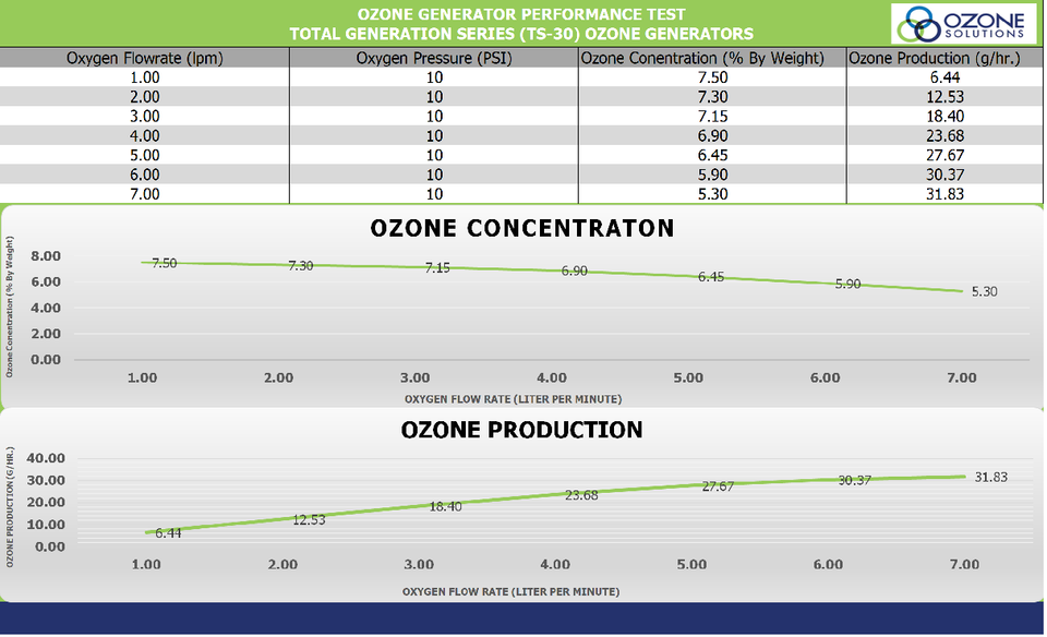 - 30 g/hr 臭氧來自 7 LPM 的氧氣,重量為 5%